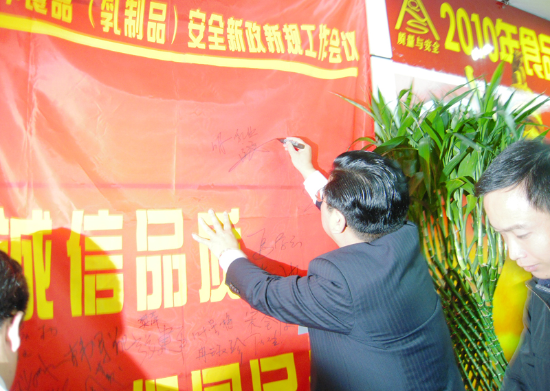 會間,參會代表和參會企業進行了“做誠信品質、保國民健康”為主題的大型簽名公益活動,企業代表共表決心,切實履行遵守新政、新法規相關規定、嚴格執行食品安全相關標準,繼續加強和改進食品安全管理,完善企業各項食品質量安全管理制度,加強食品生產質量管理,加強生產過程控制,營造放心食品安全環境。