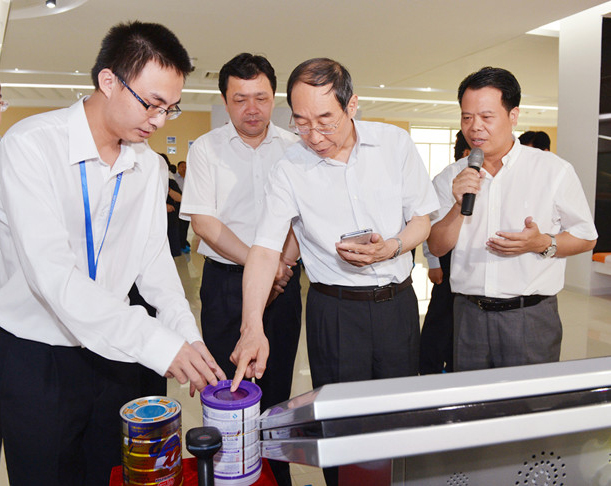 在明一文化展示廳,尤部長對明一國際的電子信息追溯系統表現出極大的興趣,并親自使用手機終端掃描查看明一奶粉的追溯結果。