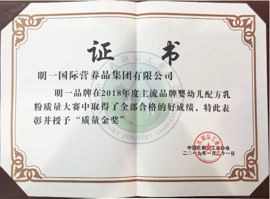 作為民族乳粉品牌的杰出代表,明一國際始終將品質放在首要位置,在2018年中乳協年度主流品牌嬰幼兒配方乳粉質量大賽中,取得全部合格的好成績。不僅證明了明一奶粉過硬的產品品質,更是對明一奶粉質量安全管理的肯定。