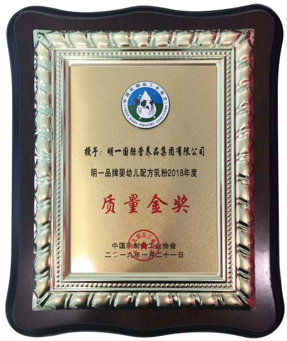 2019年1月21日,中國乳制品工業(yè)協會(以下簡稱中乳協)在京召開“第二屆中國乳業(yè)質量年會暨中乳協第六屆理事會第四次會議”。會議對在2018年度嬰幼兒配方乳粉質量大賽中獲得優(yōu)異成績的企業(yè)進行表彰。明一國際再次榮獲“質量金獎”。