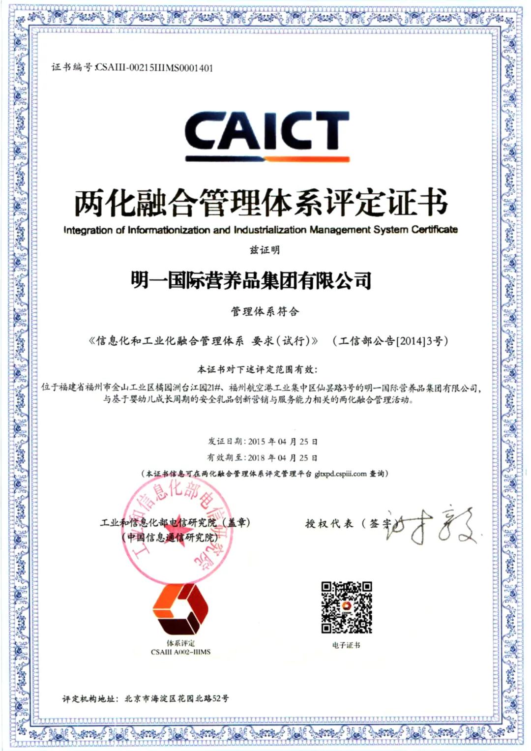 作為全國首批通過信息化和工業(yè)化融合管理體系評定的企業(yè)之一。明一國際積極推進(jìn)兩化融合工作,嚴(yán)格按照國家兩化融合整體工作部署,不斷促進(jìn)信息化和工業(yè)化相互滲透、相互融合,將信息技術(shù)、自動化技術(shù)、創(chuàng)新服務(wù)管理技術(shù)相結(jié)合,帶動產(chǎn)品研發(fā)、生產(chǎn)控制、財(cái)務(wù)管理、市場銷售和物流等信息化和數(shù)字化水平,成為奶粉行業(yè)典范。